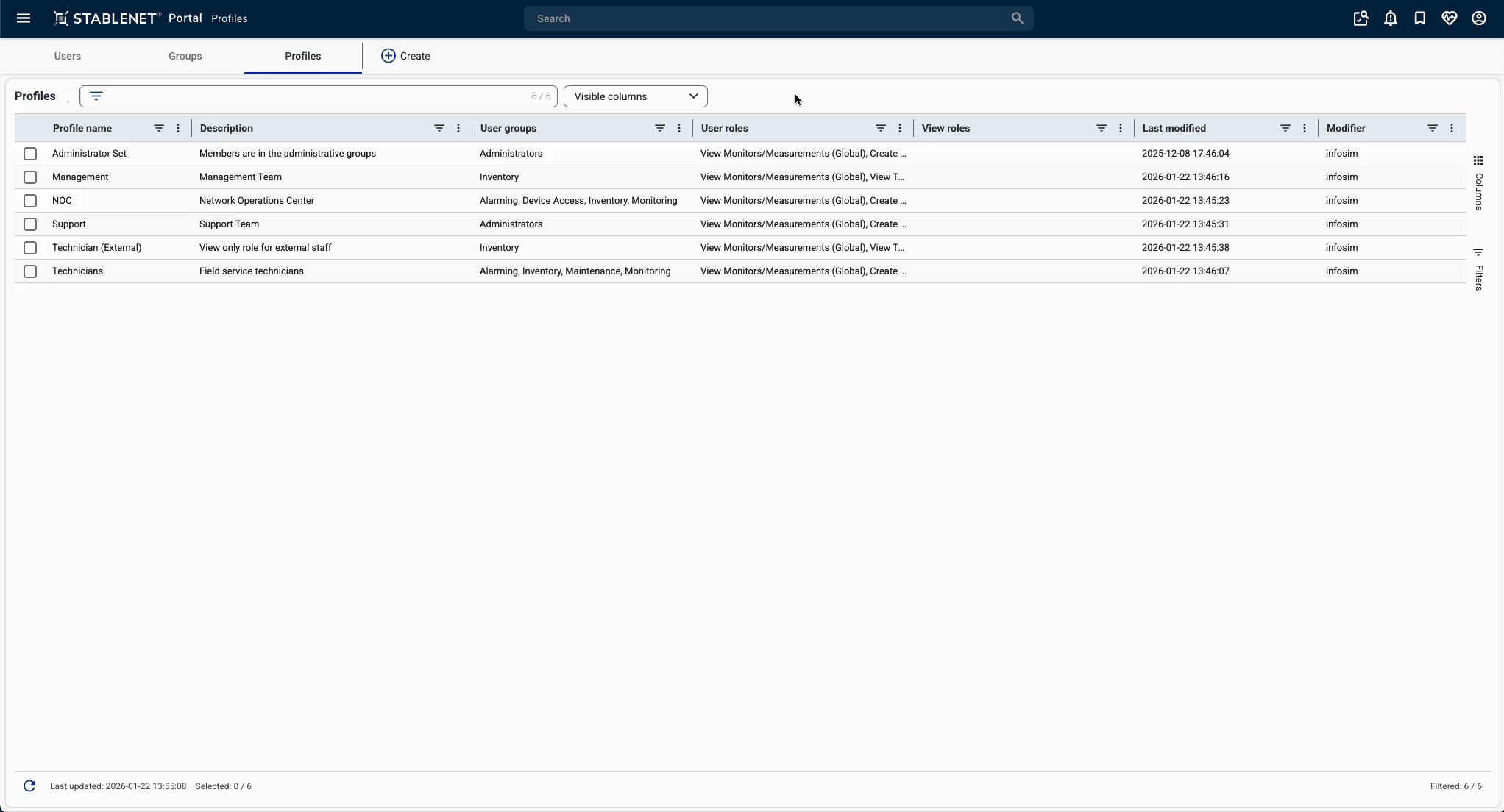 UI Profiles in StableNet® enable personalized and consistent work environments by saving views, layouts, table selections and other interface settings. These profiles can be shared between users, including access rights.
